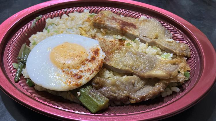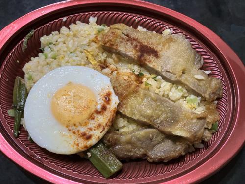 にんにく効いたパラッとしたチャーハンにカレー風味な豚、目玉焼き、オクラの組み合わせ。見た目通りの期待に応える美味しさです。