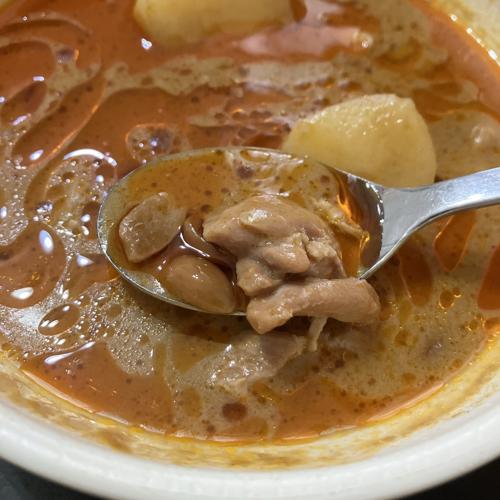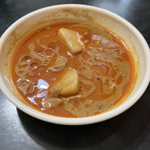 スープカレーみたいなルーに粘度のないカレーで日本カレーに無い、スパイシーで甘さがありながら辛い味わい。具材は少なめですが、ごろっとじゃがいもが美味しいですね。