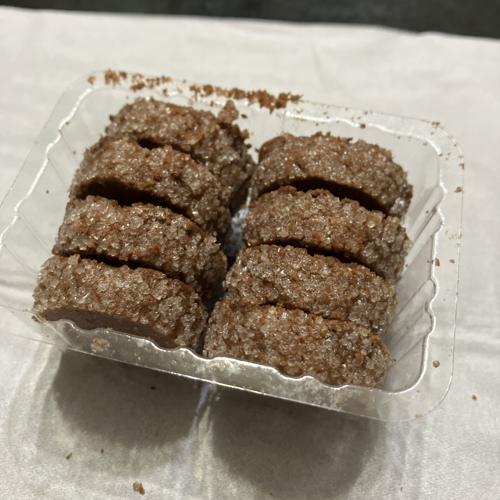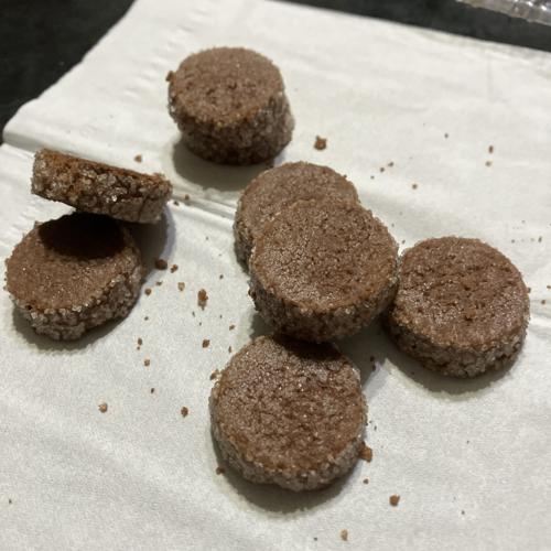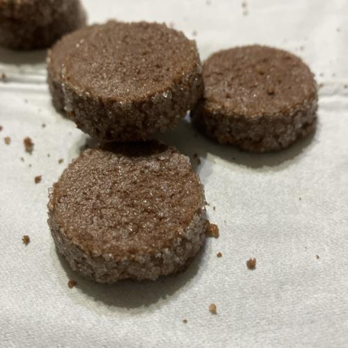 外側にザラメが付いていてバター感の強くない普通に美味しいココアクッキーです。