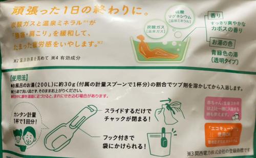 マグネシウム炭酸湯の効き目は量が少ないせいか、はっきりとは分からない印象。あまり強い特徴が無いように思えます。詰め替えで無くて、袋自体が本体でスプーン付いている「サステナパック」。スプーンの柄で簡単にチャックを閉じられて便利ですね。