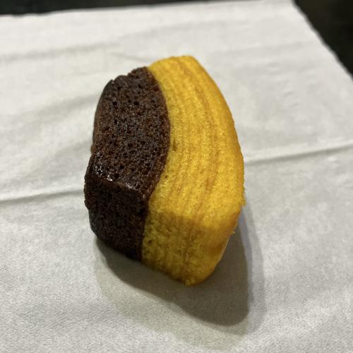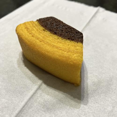 チョコの苦味をふわりと感じるバウムクーヘン。かぼちゃ感は少なめ、適度なしっとり食感で食べ心地が良いです。美味しかったです。