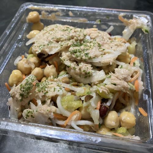 ひよこ豆と赤いんげんが大量に入っています。レンズ豆は多くても小さいので、そこまで気にならない。正直豆は添え物程度でも良いのですが、エグい量です。ツナは丁度良い分量・バランス、マリネの酸っぱさもマイルドで味はさすが成城石井さん。でも豆多すぎかな。