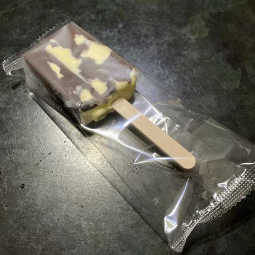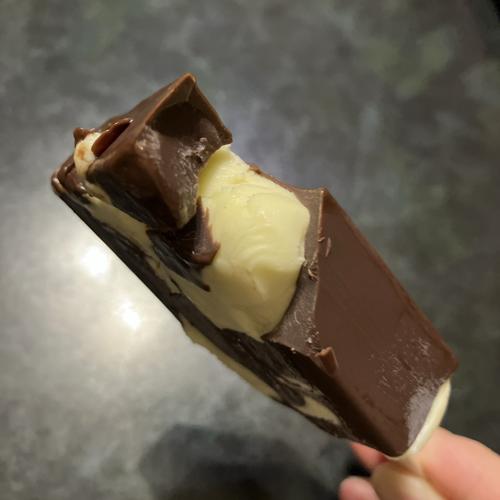 手持ち部分がやや長めで一般的なアイスより若干量が少ないかも。思った以上にチョコの塊はデカいです。うまく口を使って割れずにチョコを落としそうになりました。王道のチョコ&バニラの組み合わせ、抜群に相性良く美味しかったです。
