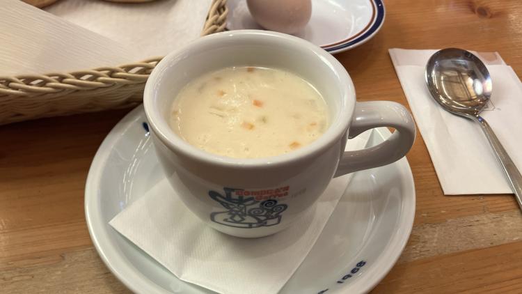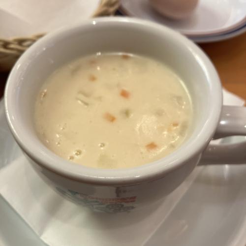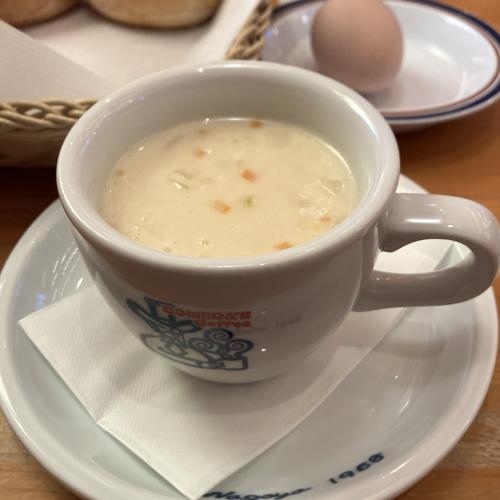 アツアツクラムチャウダー。アサリも細かくちゃんと入っています。モーニングのドリンクとして無料となるパンやゆで卵と合わせて注文可能です。大変美味しかったです。