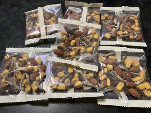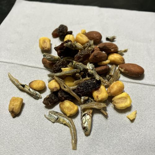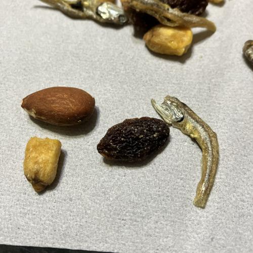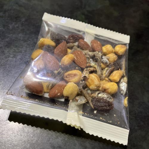 小魚(いりこ)、アーモンド、フライコーン、レーズンの組み合わせ。過剰な味付け一切なく、レーズンの甘さがじんわりあります。確かにカルシウム取れそうな味わい、個包装なのも嬉しいです。とても美味しかったです。。