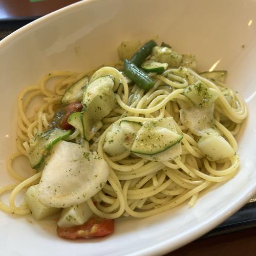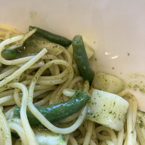 オリーブオイル+ニンニクベースで旬かぶをはじめ、じゃがいも、きゅうり、トマト、アスパラと野菜多めパスタです。バジル感少なめ、ニンニクも強くなく、口に匂いは残らない印象。とても美味しかったです。