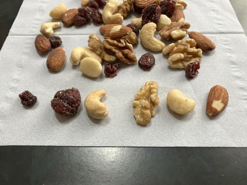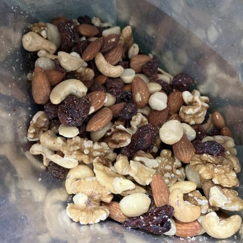 くるみ、クランベリー、アーモンド、マカダミア、レーズン、カシューナッツの組み合わせ。種類別の分量の偏りはみられず、しっかり乾燥されていて、どれも美味しいです。レビューでは湿気がちとのコメント多かったですが、今回大丈夫でした。くるみも乾燥してました。マカダミアナッツしっかり入っているところが嬉しいですね。