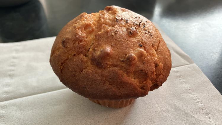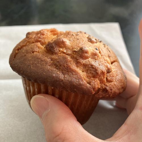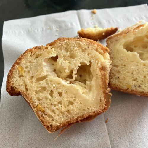 チーズ?の塩味あって、胡椒のアクセントが特徴な食事系マフィンです。中にカマンベールチーズが見られ、相対的に生地は少し甘味を感じます。大変美味しかったです。