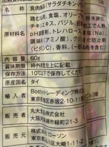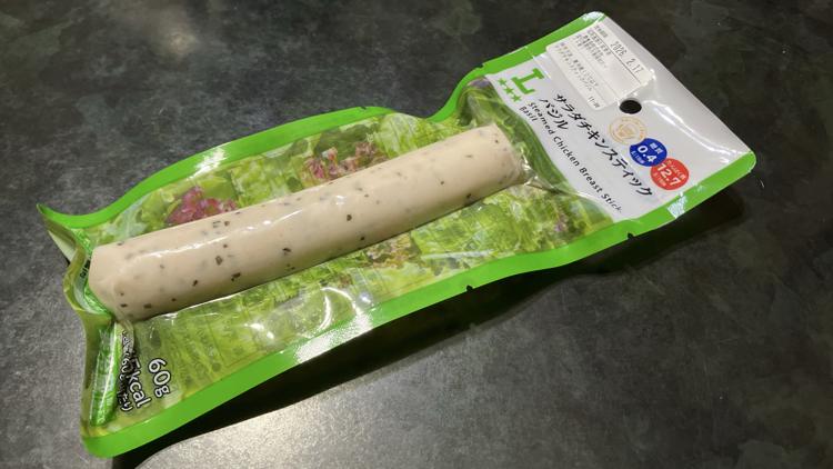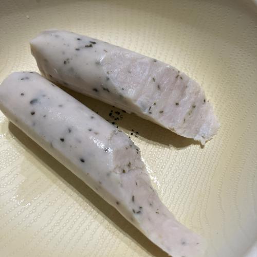 見た目魚肉ソーセージなサラダチキン。柔らかくて、ちょっとバジルの味わいあります。もします。なかなか美味しかったです。