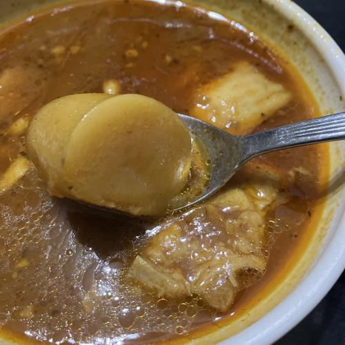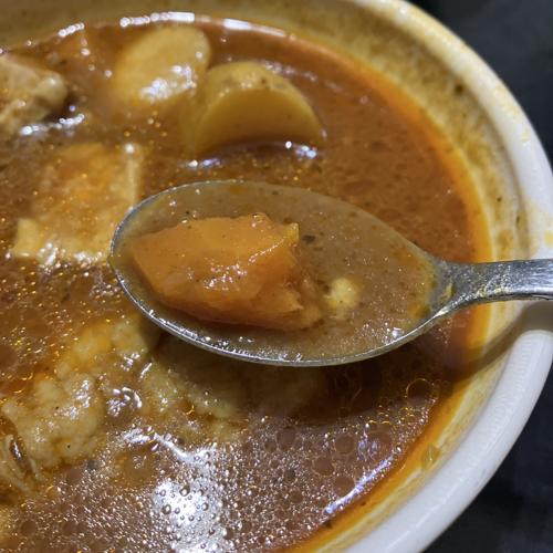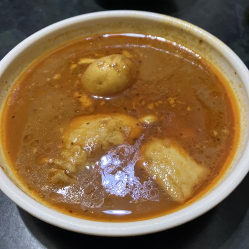 豚肉、じゃがいも、人参と、入っている具材はごろっと大きめに入っています。スープは食べやすいながらも本格的、トマトの酸味を少し感じます。とても美味しかったです。あり。
