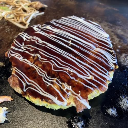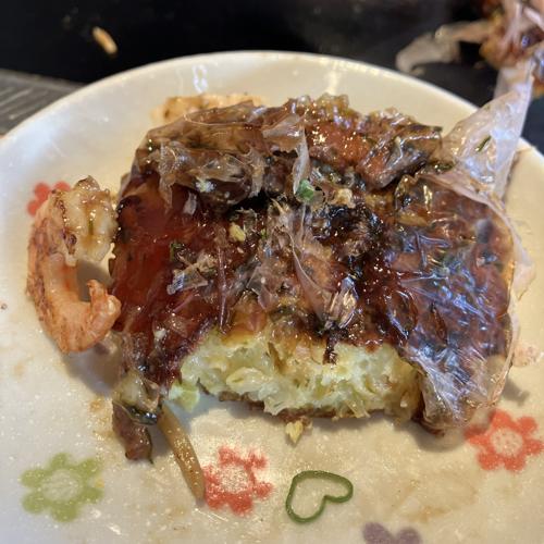上部に乗っている豚肉はカリカリに焼けていて、中の生地はふわりとした食感です。具材には海老、イカが使われています。量は少なめですが、大変美味しかったです。