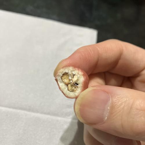 2025/12福袋のオマケ(プラスワン)品。甘酸っぱくホワイトチョコ主体な味わいです。ピーカンナッツの食感やコクが良く合います。どの味付けに対してもピーカンナッツはうまくマッチしてちて、このみみさんの技術力素晴らしいです。