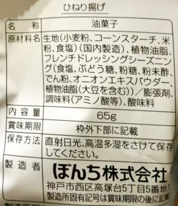 フレンチドレッシング味ということで、酸味を感じる味わい、ひねり揚げらしい風味です。油菓子だけど、それほど重たくない印象。なかなか美味しかったです。