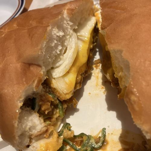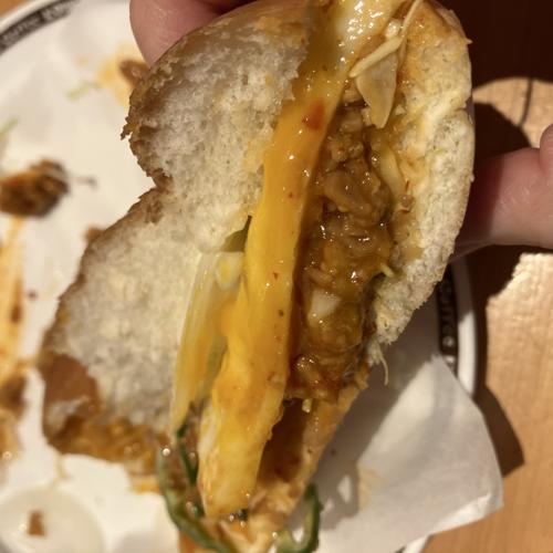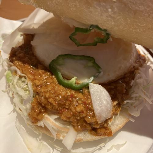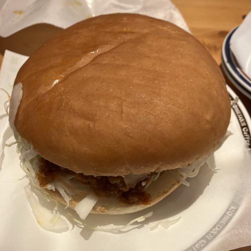 ドムドムバーガーとのコラボ商品。旨辛ミンチと目玉焼きの入った味自体は美味しいですが、かなり辛いです。ミルク系のコーヒーやデザートを意識して、辛さを抑えつつ注文したいですね。
