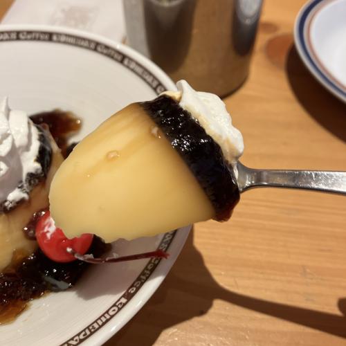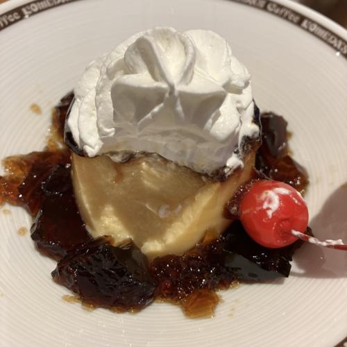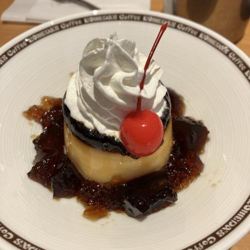 コメダのプリン。周りに珈琲ゼリー、上にホイップクリームとさくらんぼを添えていて、皿は冷たく提供されます。ゼリーやホイップクリームの味わいはマイルドで、カラメルでなくてプリン部分は甘苦い印象。やや柔らかな丁度良いのプリンの硬さ、ちょっと大人っぽいスイーツだと思います。値段は高いですが、なかなか美味しかったです。