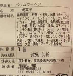 2026/03/23 【食の記録】磯笛さんの「バウムクーヘン」を頂きました。 出費 満足度:★★★★★(最高5つ) 製造元:有限会社 磯笛 購入月:2026/2 ひとこと感想 硬くて食感良く、適度な甘味&バター感もあるハードバウムクーヘンです。かなり美味しかったです。 食品情報 関連記事 【まとめ】スイーツ・おやつ商品記事のまとめページ 外部リンク 磯笛公式ページ 【バウムクーヘン】 【焼菓子】 【磯笛】 【菓子】