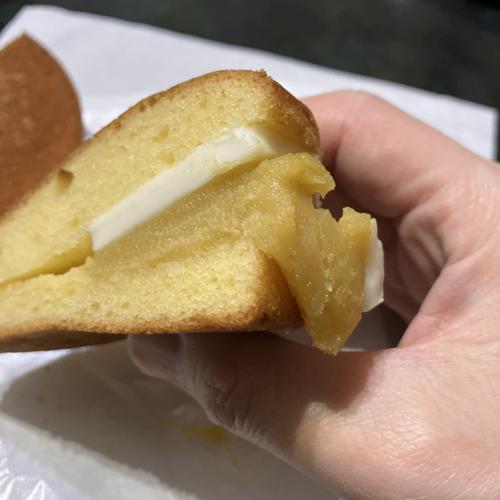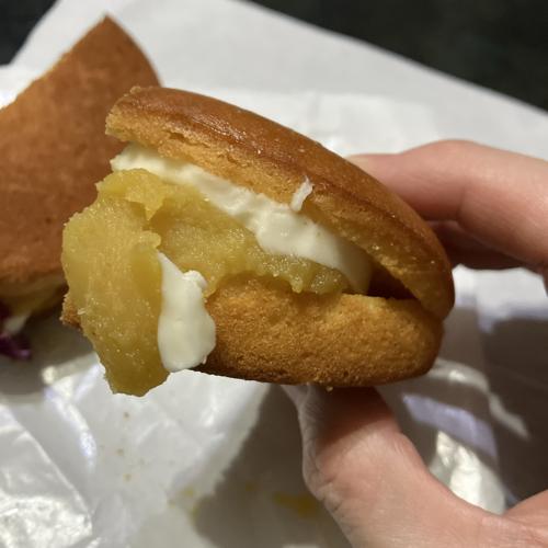 グルテンフリースイーツ。ちょい硬めなしっとりバター生地が硬めなケーキのスポンジみたいな味わい、スイートポテトあんの風味が良く、厚めのクリームチーズとの相性抜群です。とても美味しかったです。