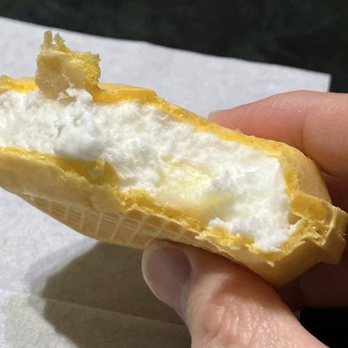 シンプルなバニラモナカアイスの中に練乳が入っています。正直、練乳無くてもさっぱりめな美味しさありますが、練乳を加えてより甘くなった味わいも悪くないです。
