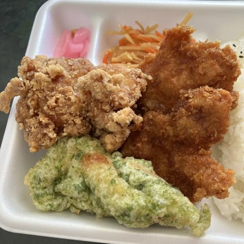 からあげ1個、のり塩からあげ1個、新潟タレカツ2枚の組み合わせ。今回唐揚げは醤油を選択。味濃いめでニンニク効いてててとてもジューシー!ご飯自体がちょっと瑞々しくて、とても美味しい。新潟タレカツはやや甘めな味わい、表面サクサク。のり塩は風味良くて、中身みは、ささみぽい感じ、ジューシー柔らかめ。どれもとても美味しかったです。