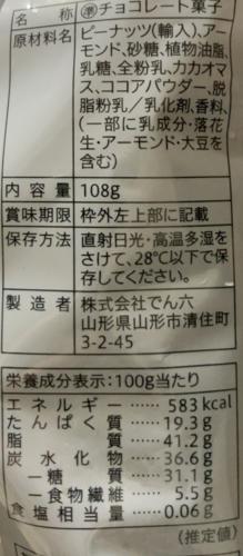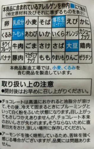 ピーナッツとアーモンドとあるが、アーモンドの主張は薄くピーナッツが主役。ピーナッツの風味がとても良いです。チョコとのバランスが取れた味わい、硬すぎずな適度な食感です。