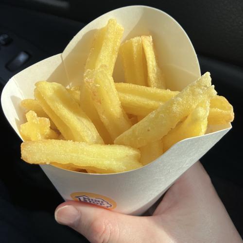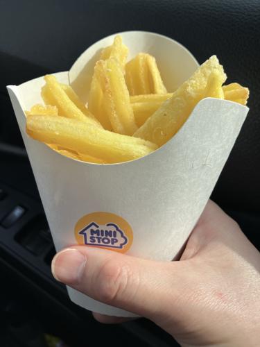 星型(X)で形成されたミニストップさんのフライドポテト。表面の適度な塩味あり、表面の揚げたちょっと硬い部分好きです。中身がホクホクのポテトが主張しているのが美味しいポイントだと思います。
