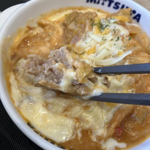 特盛まで無料でしたが、今回は並盛りで。チーズがどっさり入っていて、松屋さん定番のしっかりニンニク的な味付けが効かせてあります(食後は余り臭くない)。ハンバーグが柔らかでパクパク食べられます。ソース部分はスプーン使ってご飯に乗せたりして、しっかり頂きました。キャベツも多めに入っています。とても美味しかったです。