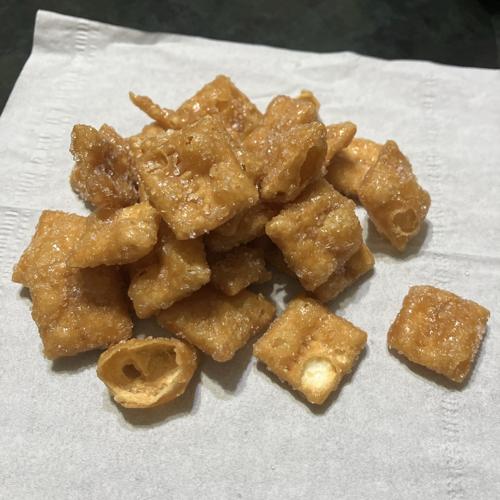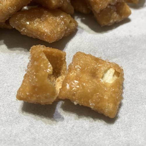小さくて、若干軽い口当たりなかりんとうです。かりんとうらしい香ばしさとざらめの甘さ、食感が良くて美味しかったです。
